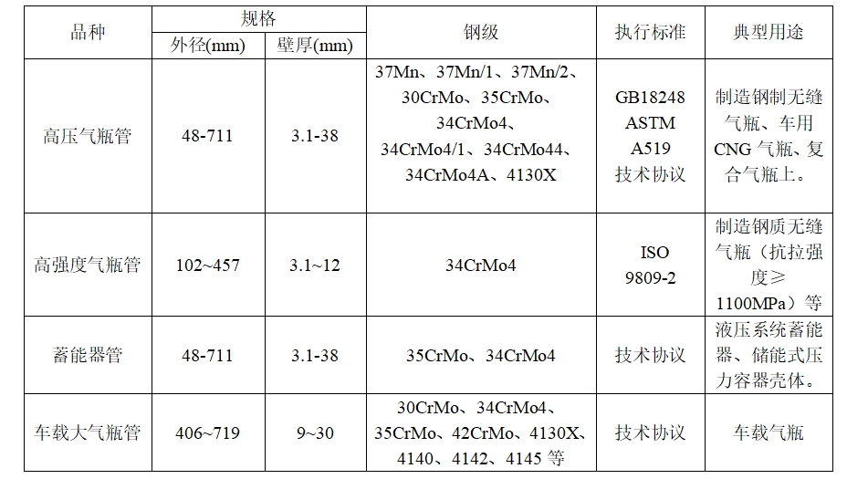 用于制造钢制无缝气瓶、车用CNG气瓶、复合气瓶。我乐玩体育官方网站生产的高压气瓶管为管制瓶制造提供优 质的热轧薄壁无缝钢管,具有内外表面质量好、壁厚均匀、质量轻、生产率和成材率高、成本低等优点,便于无缝管制瓶瓶底收口的关键技术的应用,使气瓶管的制 造从采用钢坯经冲孔拉拨转向采用薄壁无缝钢管制造,并已成为发展趋势,深受用户欢迎。