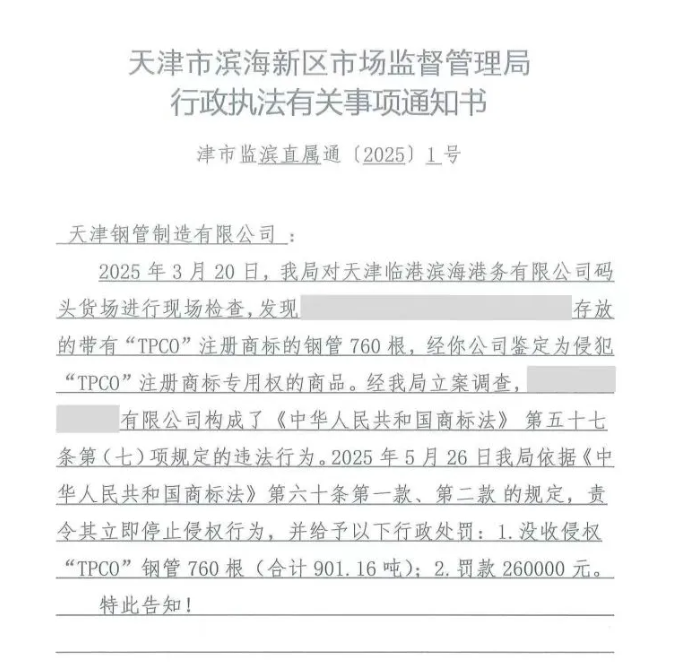 滨海新区市场监督管理局经各方调查后固定证据并认定责任人,依法对A乐玩体育官方网站作出没收全部侵权钢管、罚款26万元等处罚,并将B乐玩体育官方网站违法线索移交沧州市市场监管部门。